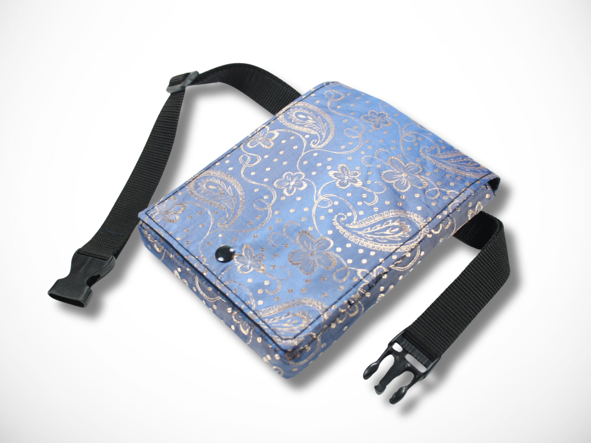 Die Tasche wird aus blauem Baumwollstoff mit beigen Ornamenten und Blumen Motiven angefertigt. Die Ornamente schimmern im Licht. Für die Stabilität der Tasche sorgt eine Verstärkung des Stoffes.Der Innenbereich der Tasche ist ein schwarzer Baumwollstoff, den du zum reinigen einfach heraus ziehen kannst.