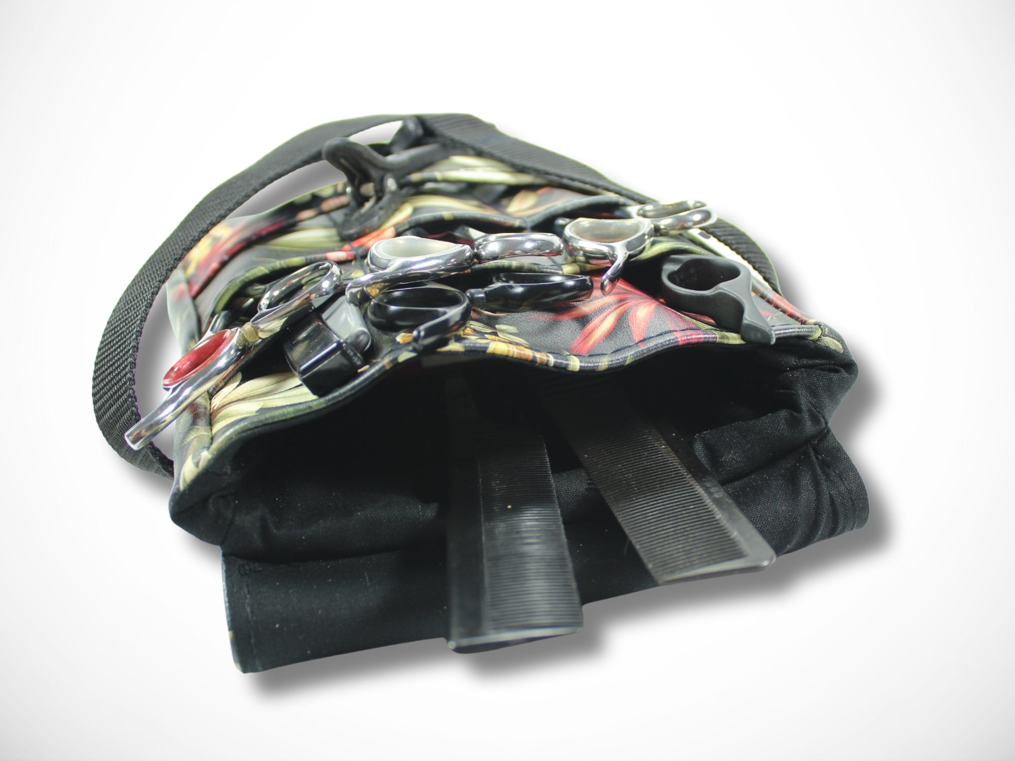 - Vorne 6 Fächer für Scheren, Messer und Kämme und eine Schlaufe für bis zu 9 Clips
