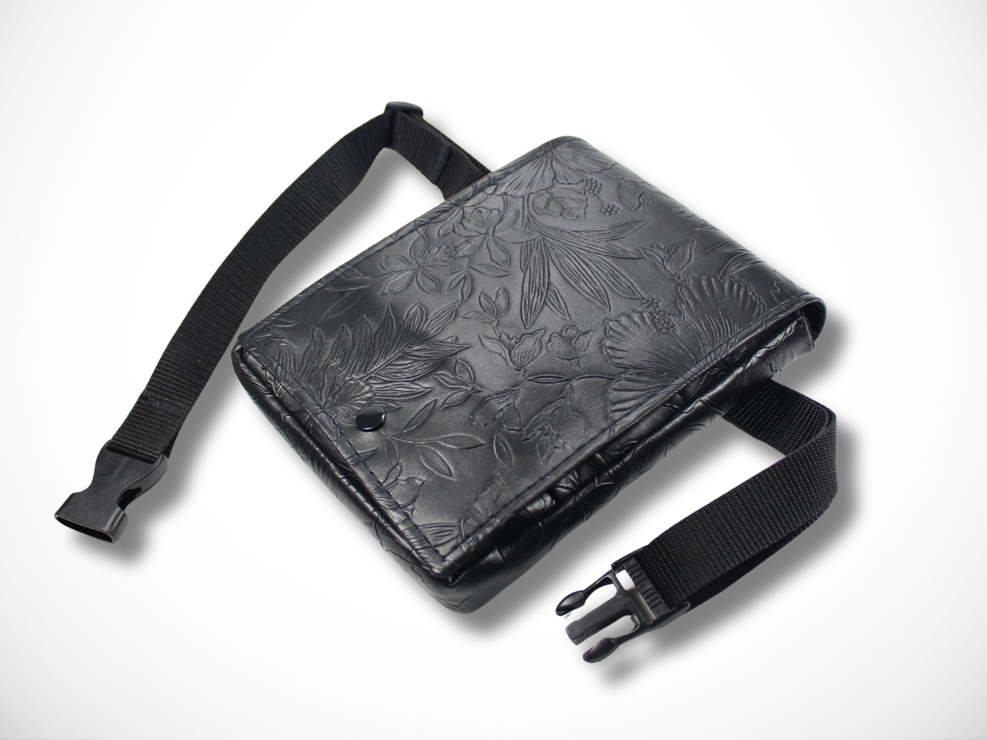 Die Tasche wird aus schwarzem Kunstleder mit geprägten Blumen angefertigt.