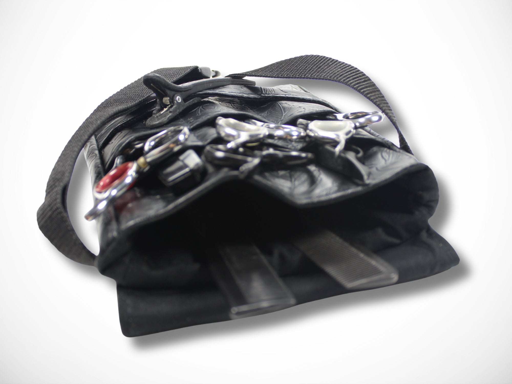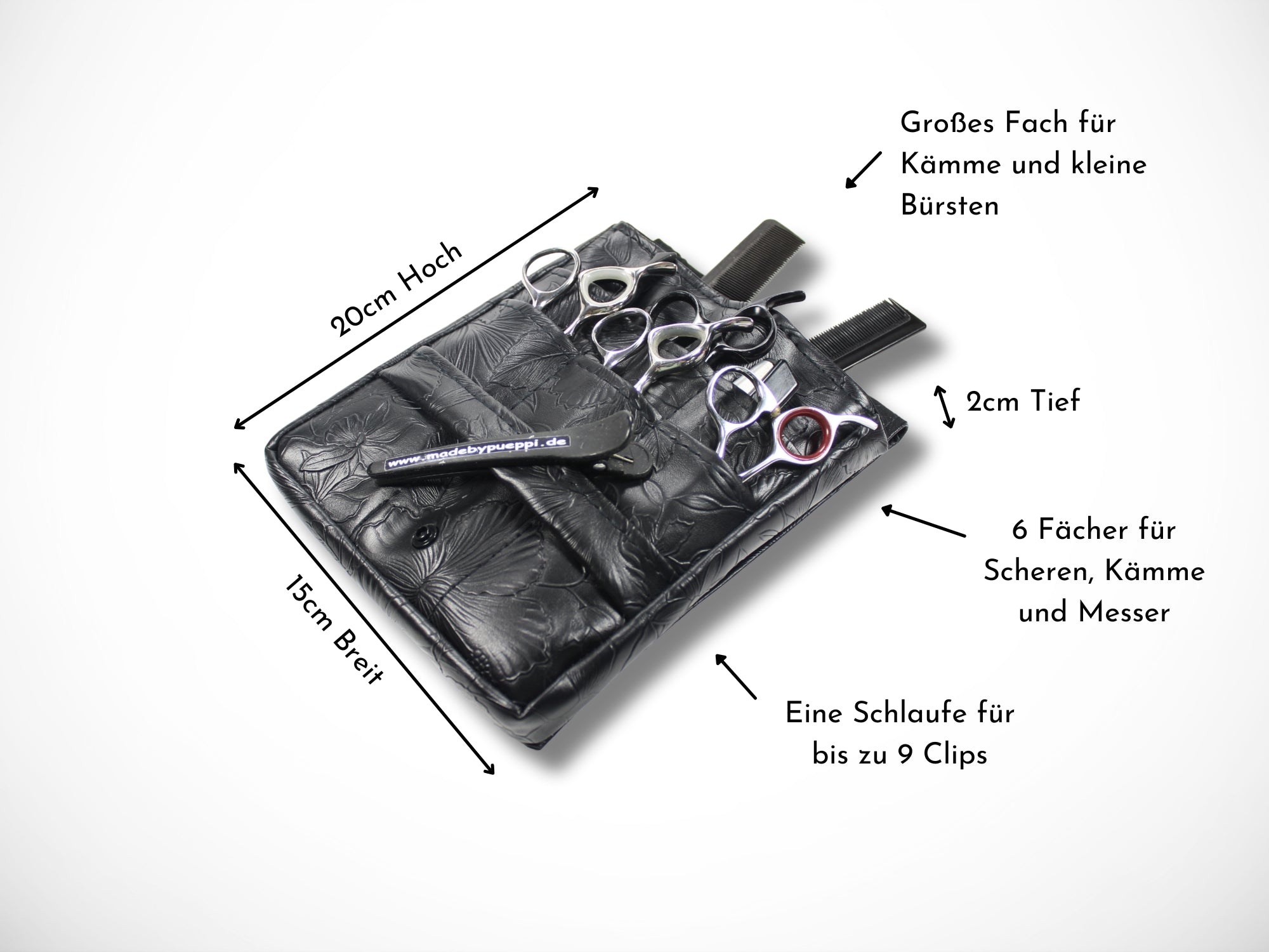 - Vorne 6 Fächer für Scheren, Messer und Kämme und 3 Schlaufen für bis zu 9 Clips