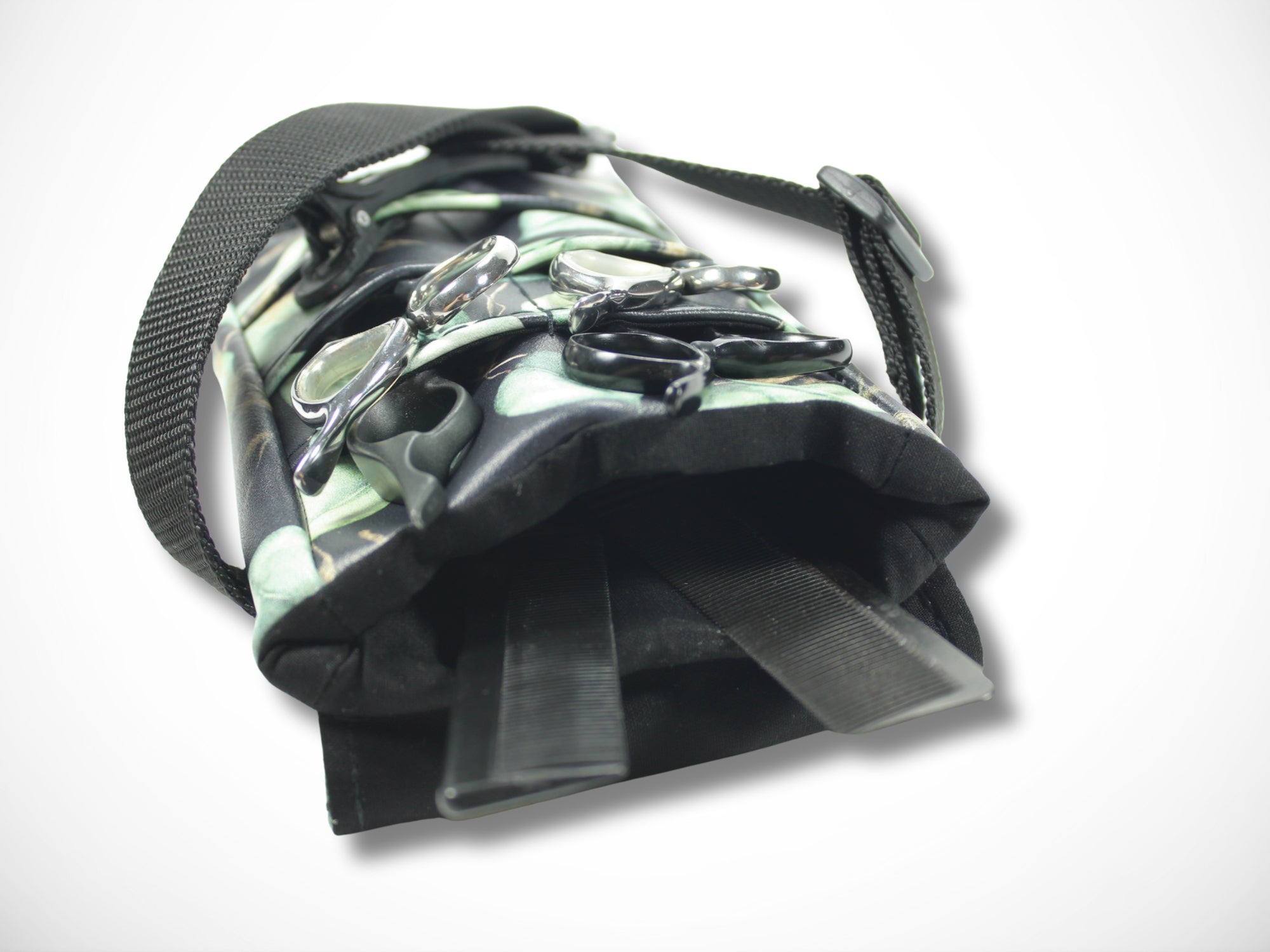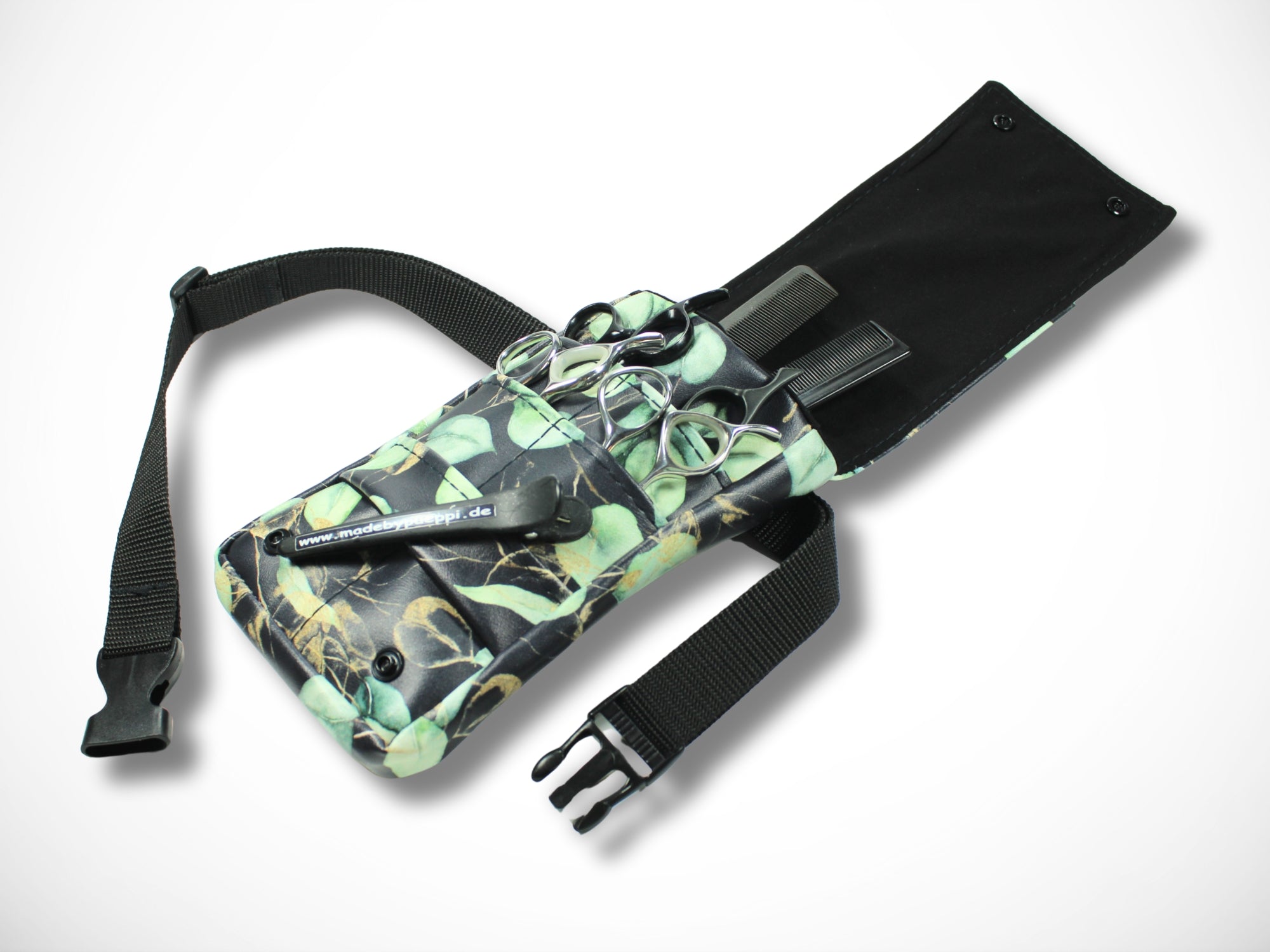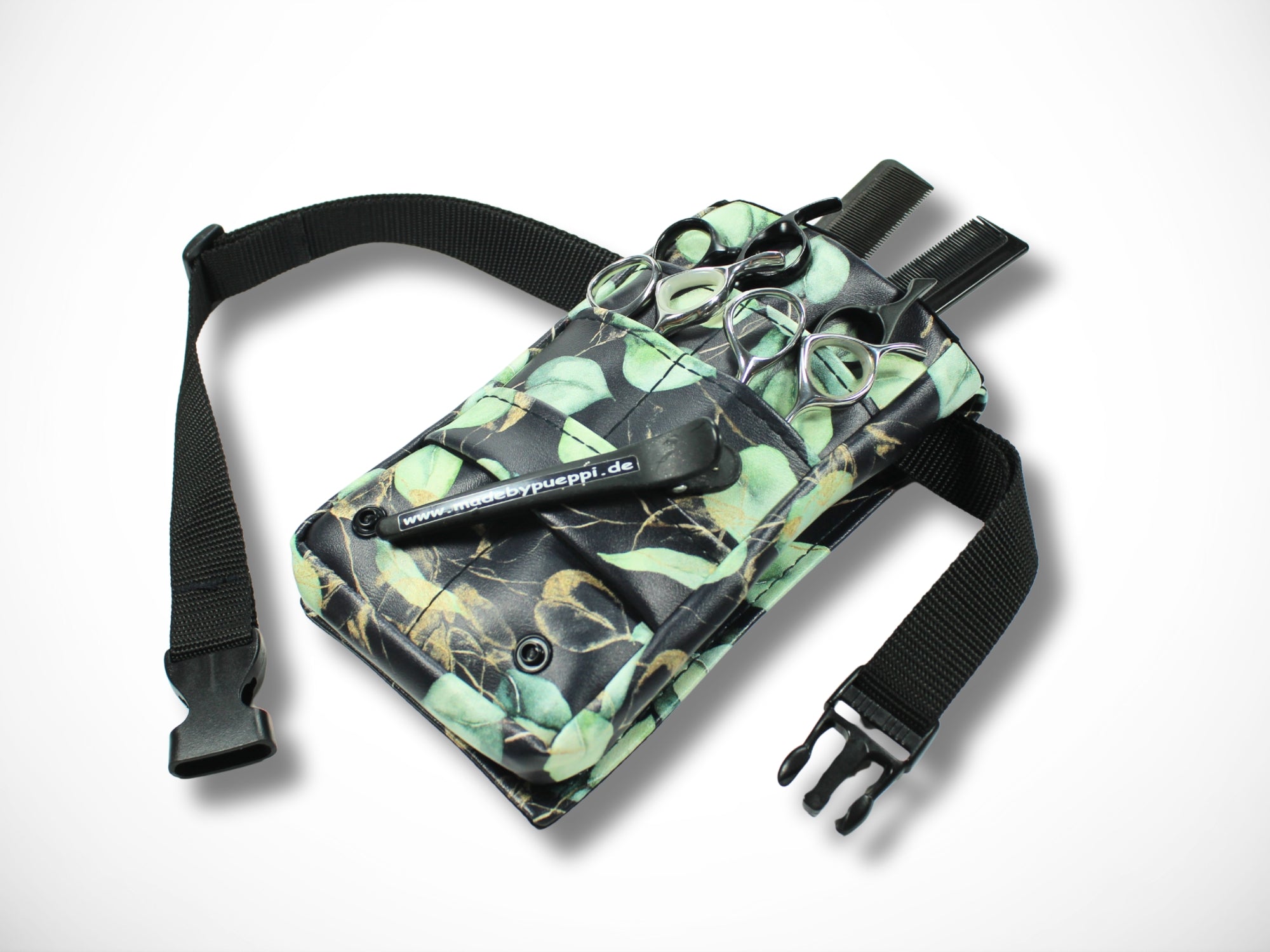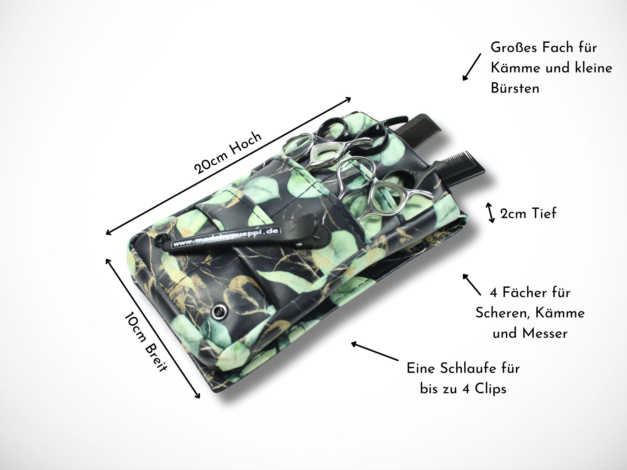 Sie wird als Gürteltasche getragen und bietet viel Platz für deine Scheren, Messer und Kämme.