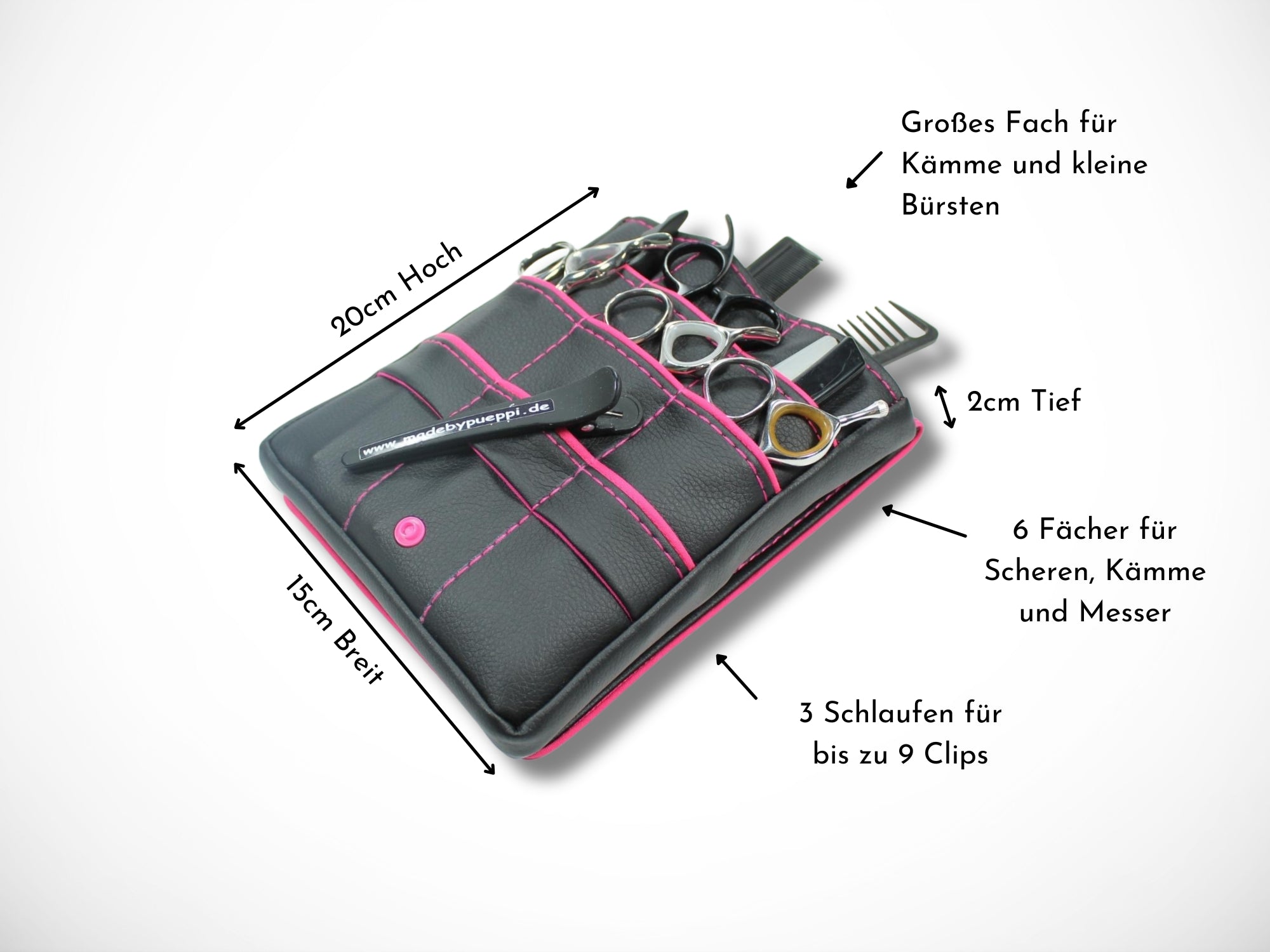 - Vorne 6 Fächer für Scheren, Messer und Kämme und 3 Schlaufen für bis zu 9 Clips