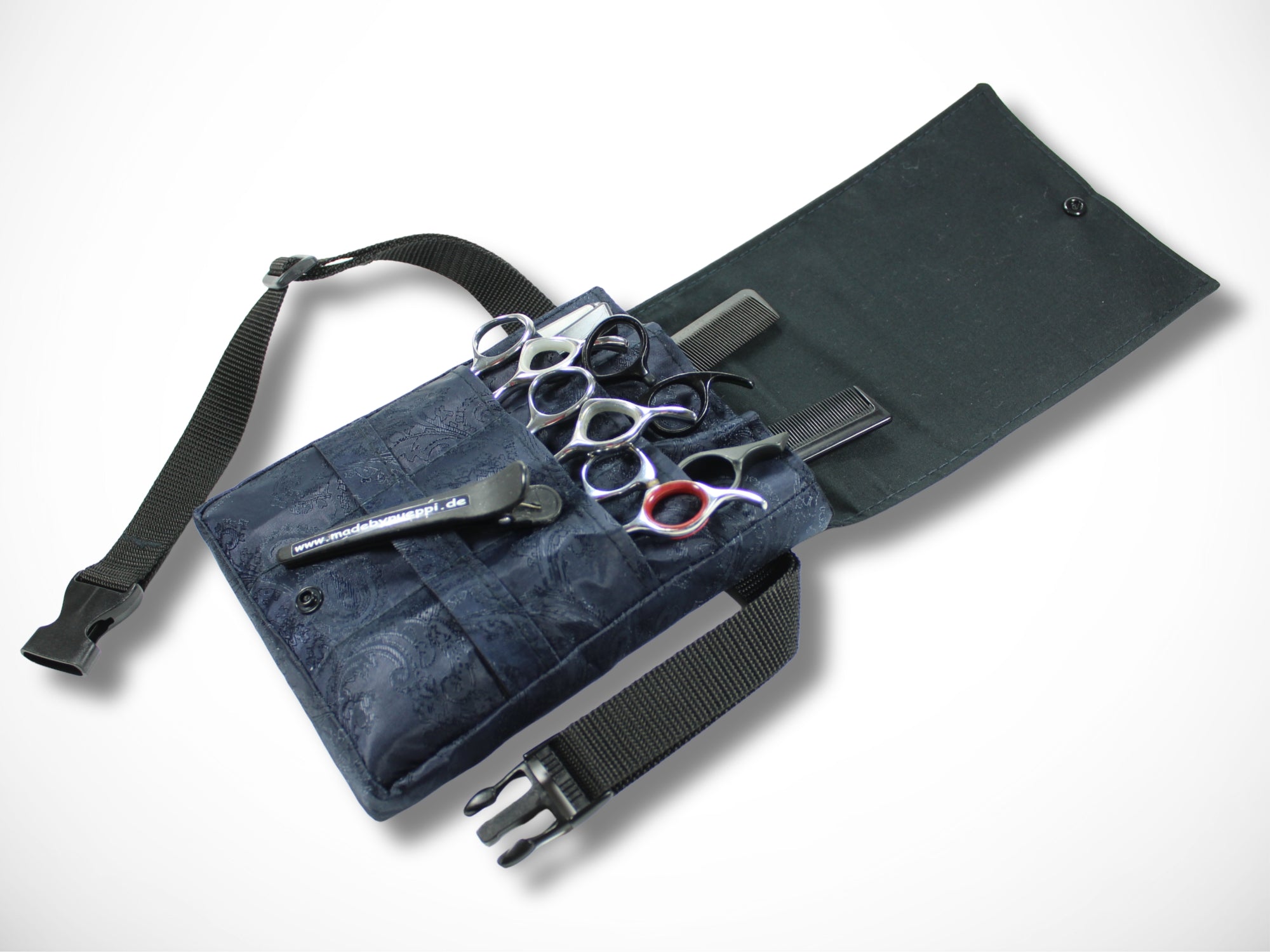 Sie wird als Gürteltasche um die Hüfte getragen und bietet viel Platz für deine Scheren, Messer und Kämme.