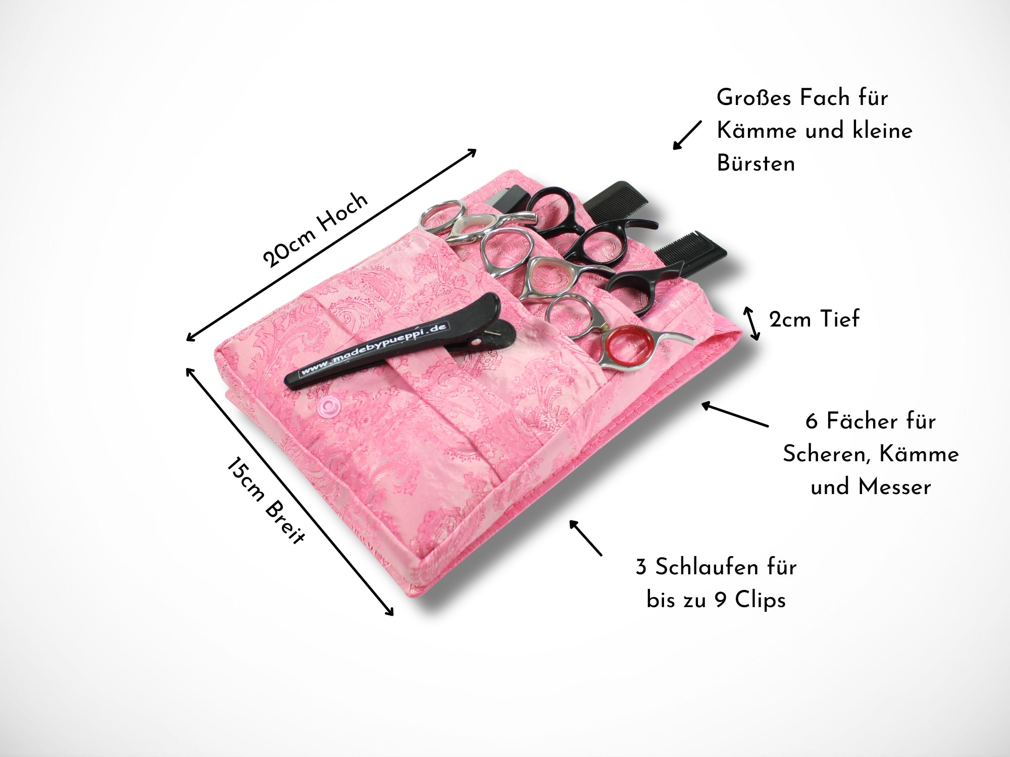 - Vorne 6 Fächer für Scheren, Messer und Kämme und 3 Schlaufen für bis zu 9 Clips