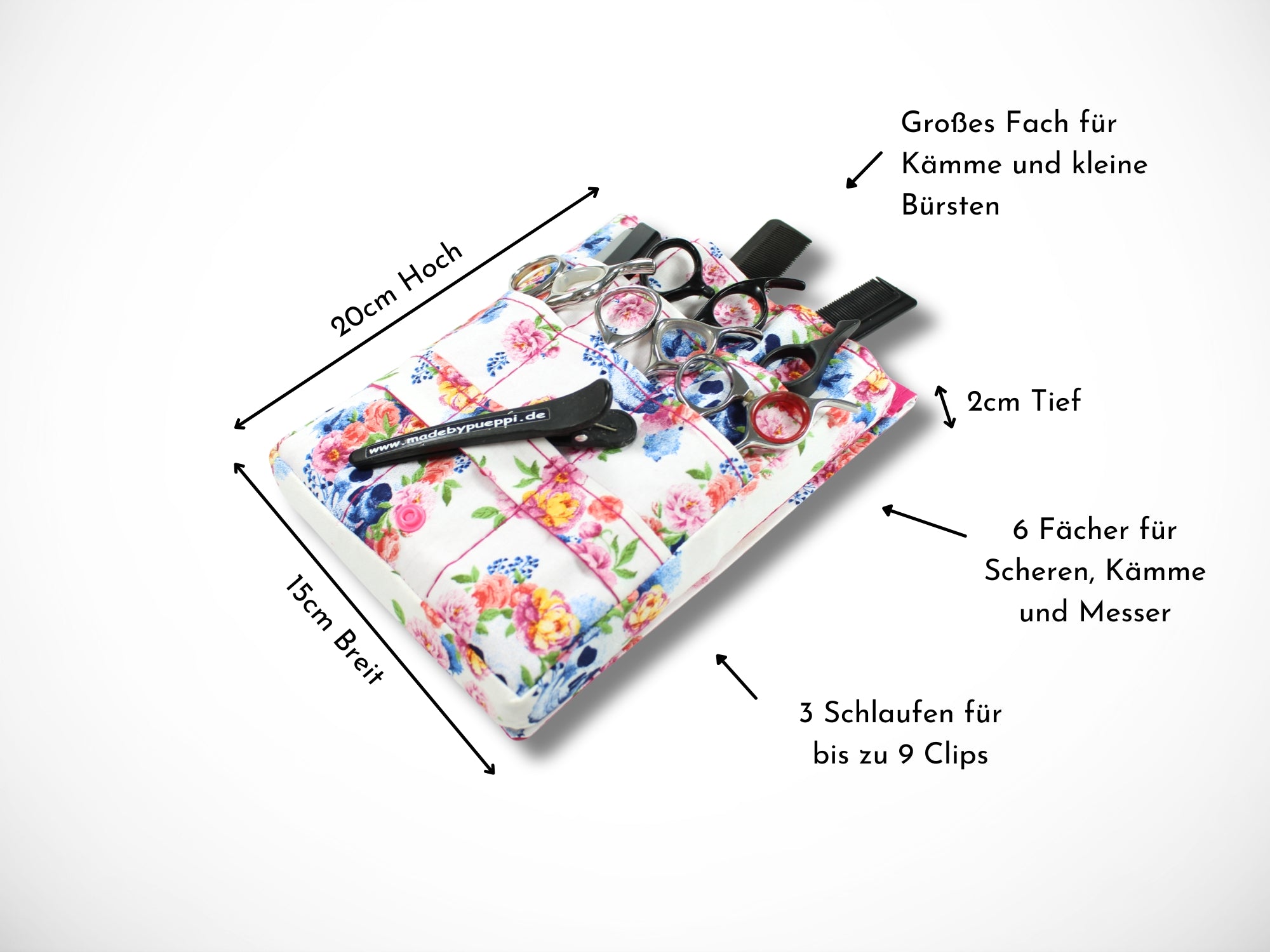 - Vorne 6 Fächer für Scheren, Messer und Kämme und 3 Schlaufen für bis zu 9 Clips
