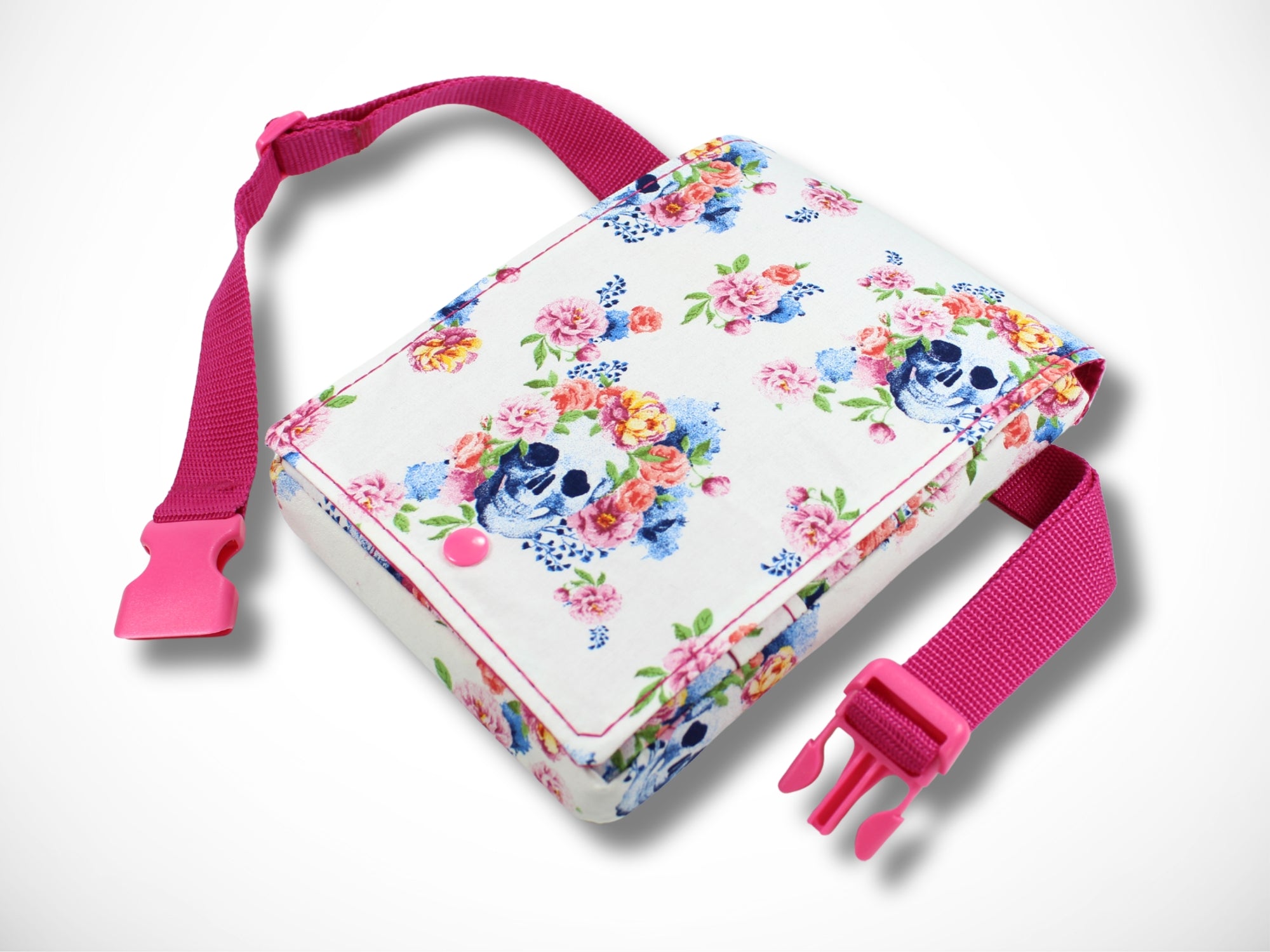 Die Tasche wird aus weißem Baumwollstoff mit Totenkopf und Blumen Motiven angefertigt. Für die Stabilität der Tasche sorgt eine Verstärkung des Stoffes.