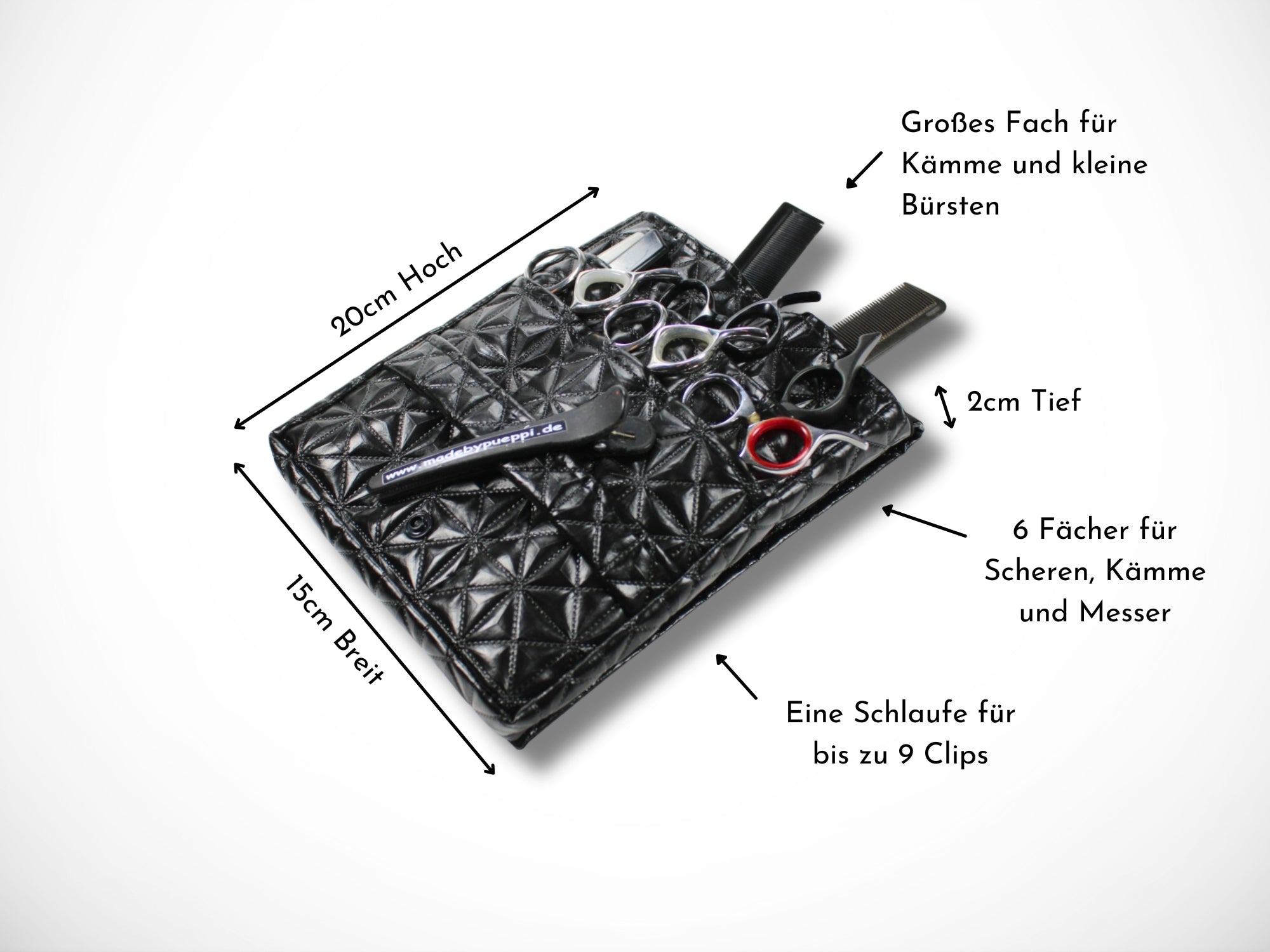 - Vorne 6 Fächer für Scheren, Messer und Kämme und eine Schlaufe für bis zu 9 Clips