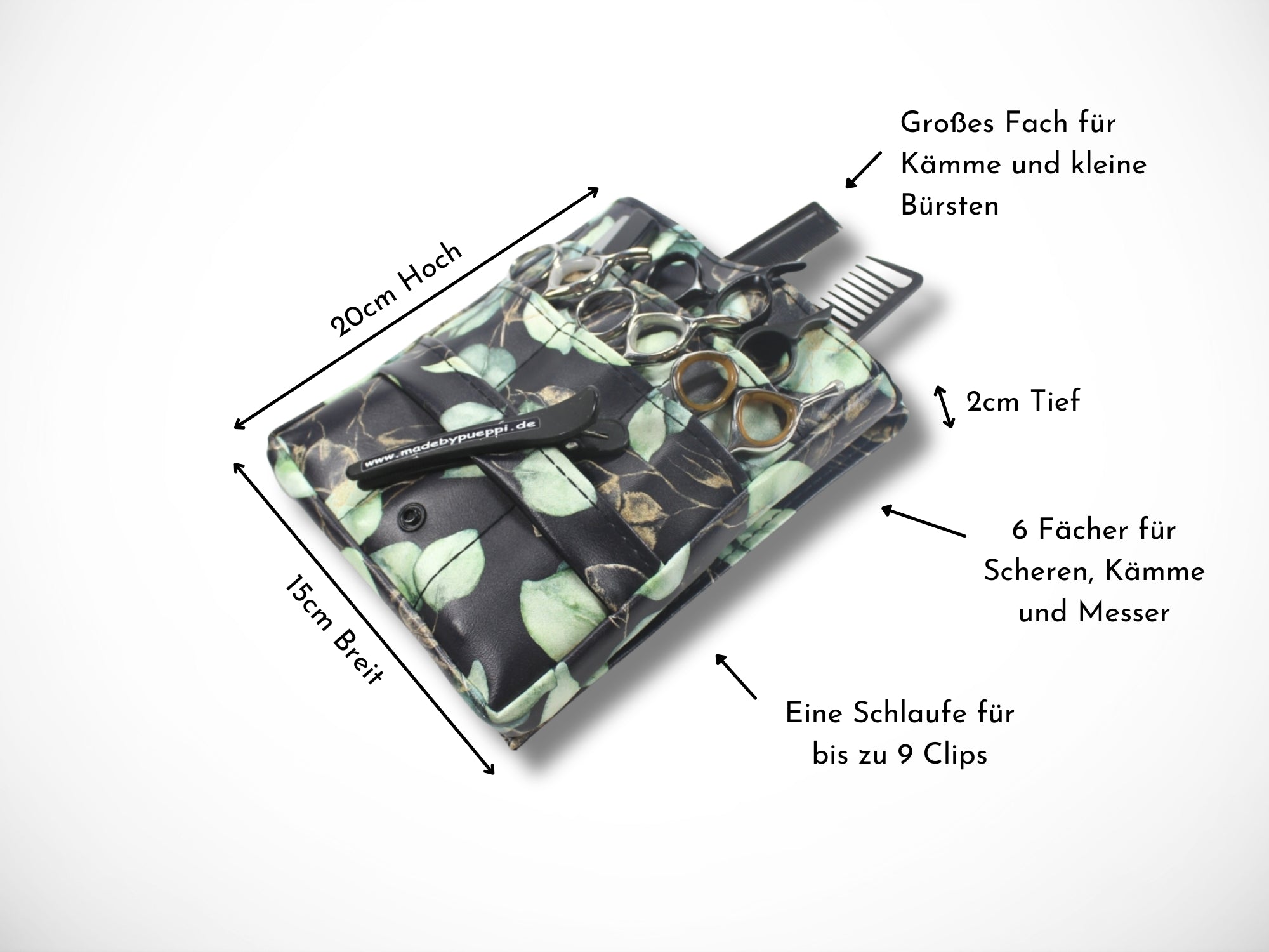 She is worn as a belt bag and offers plenty of space for your scissors, knives and combs.