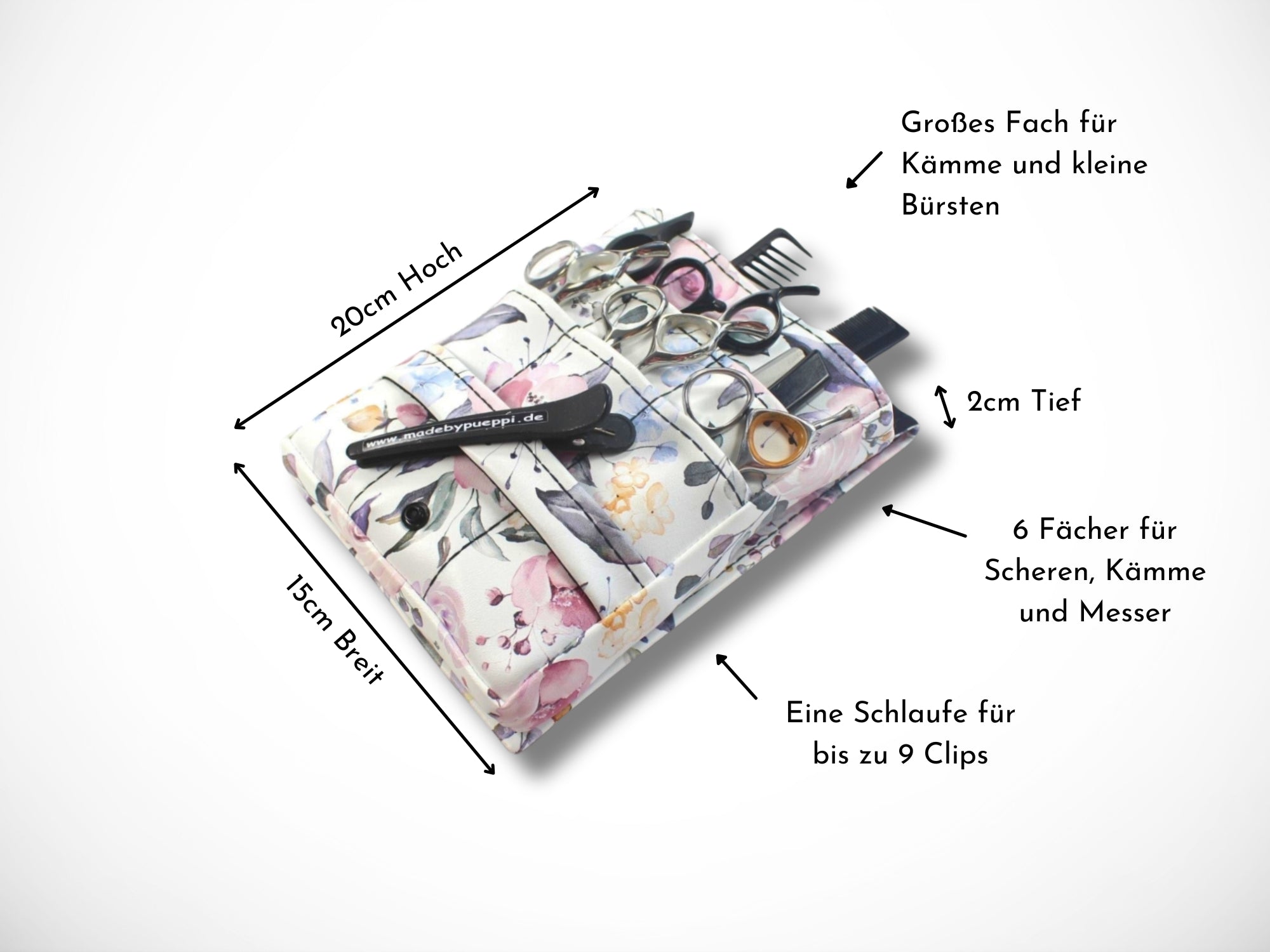 She is worn as a belt bag and offers plenty of space for your scissors, knives and combs.