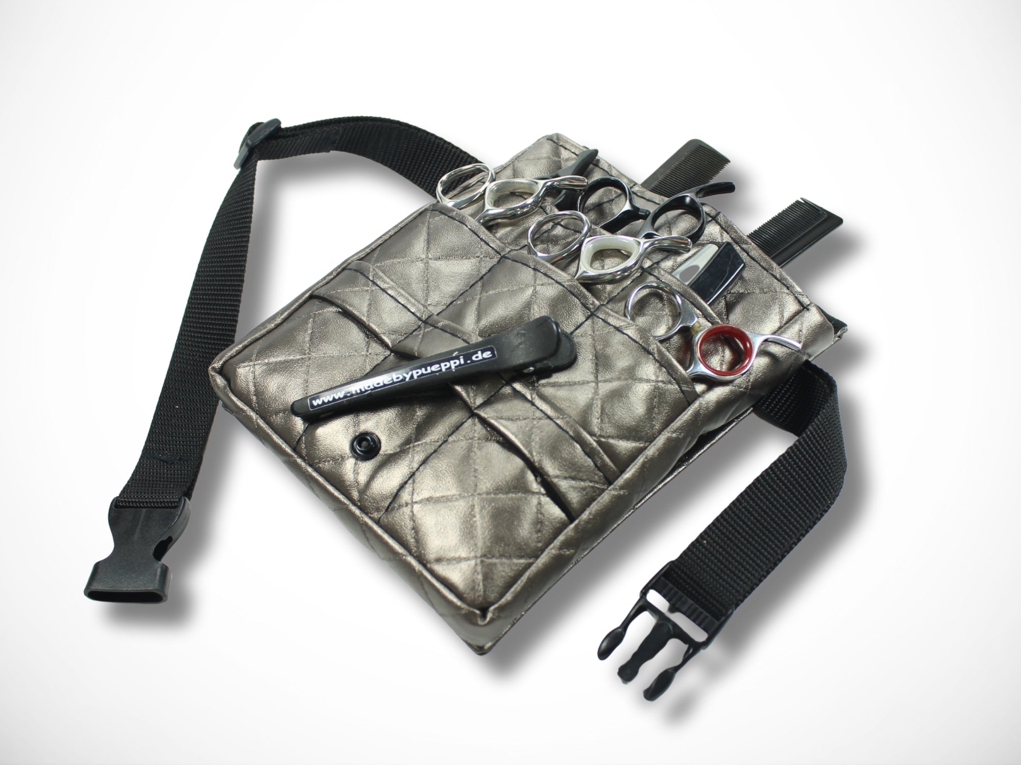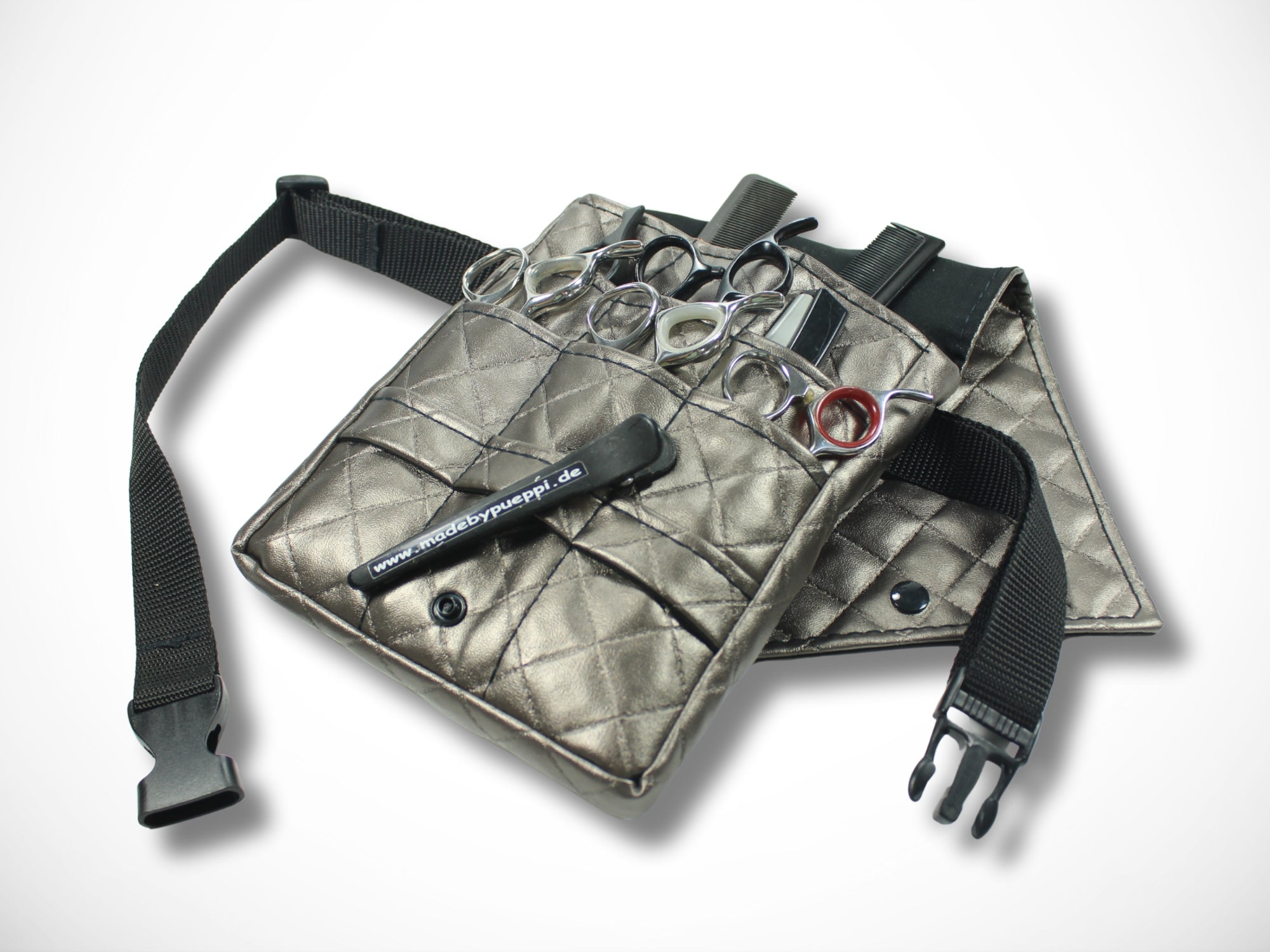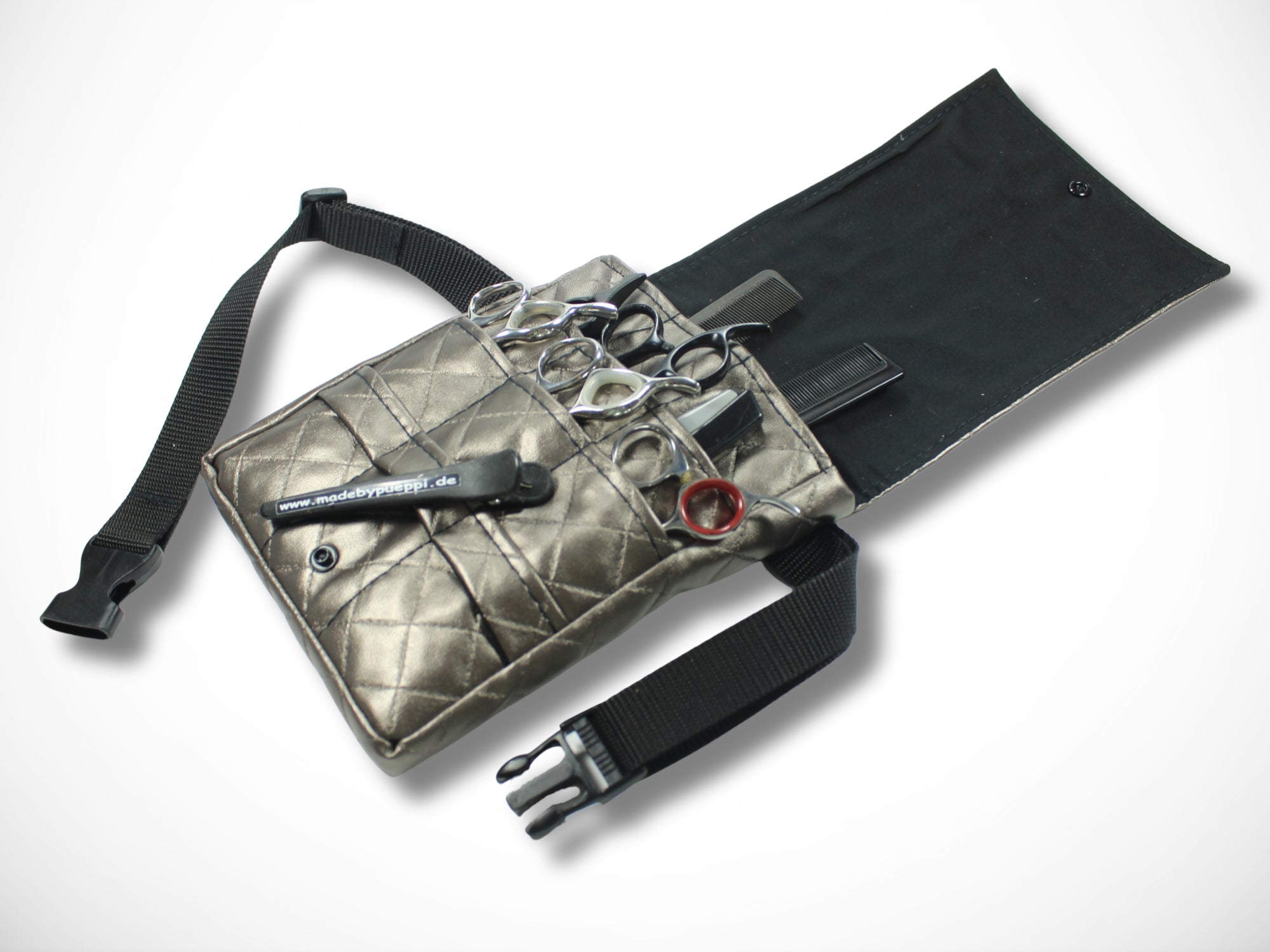 It is worn as a belt bag around the hips and offers plenty of space for your scissors, knives and combs.