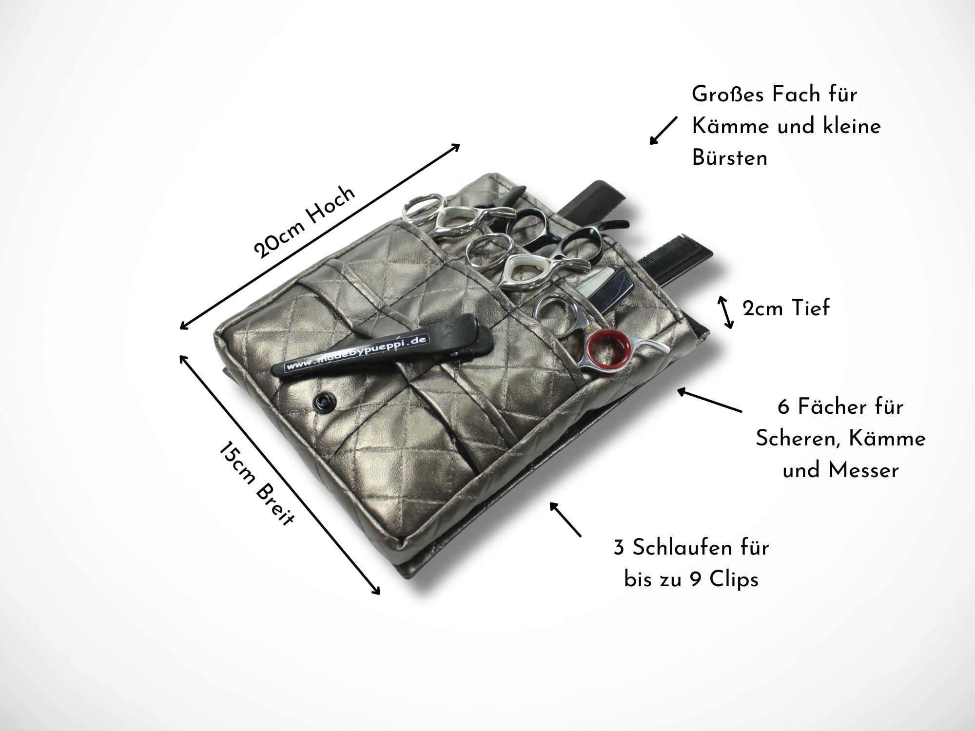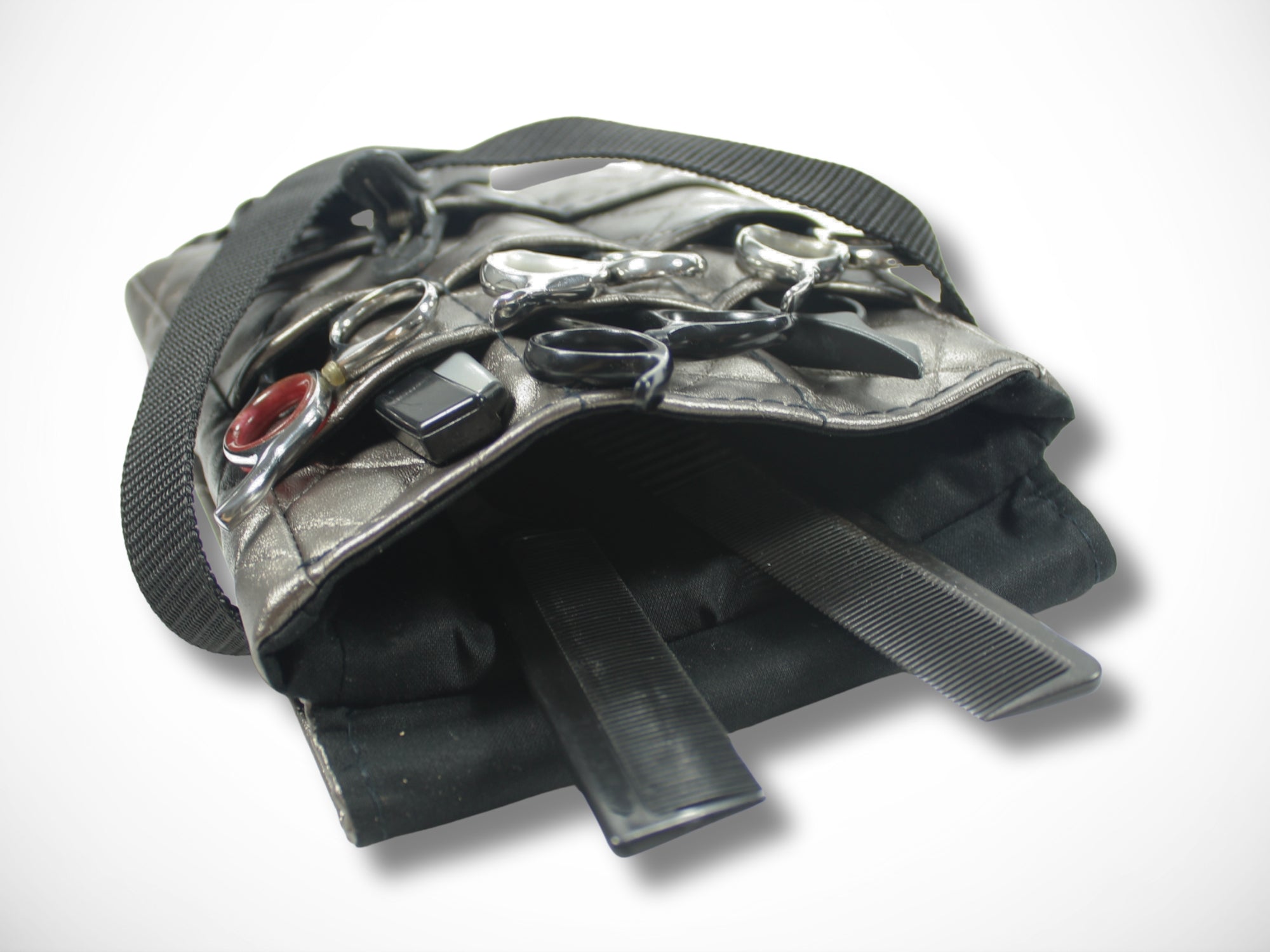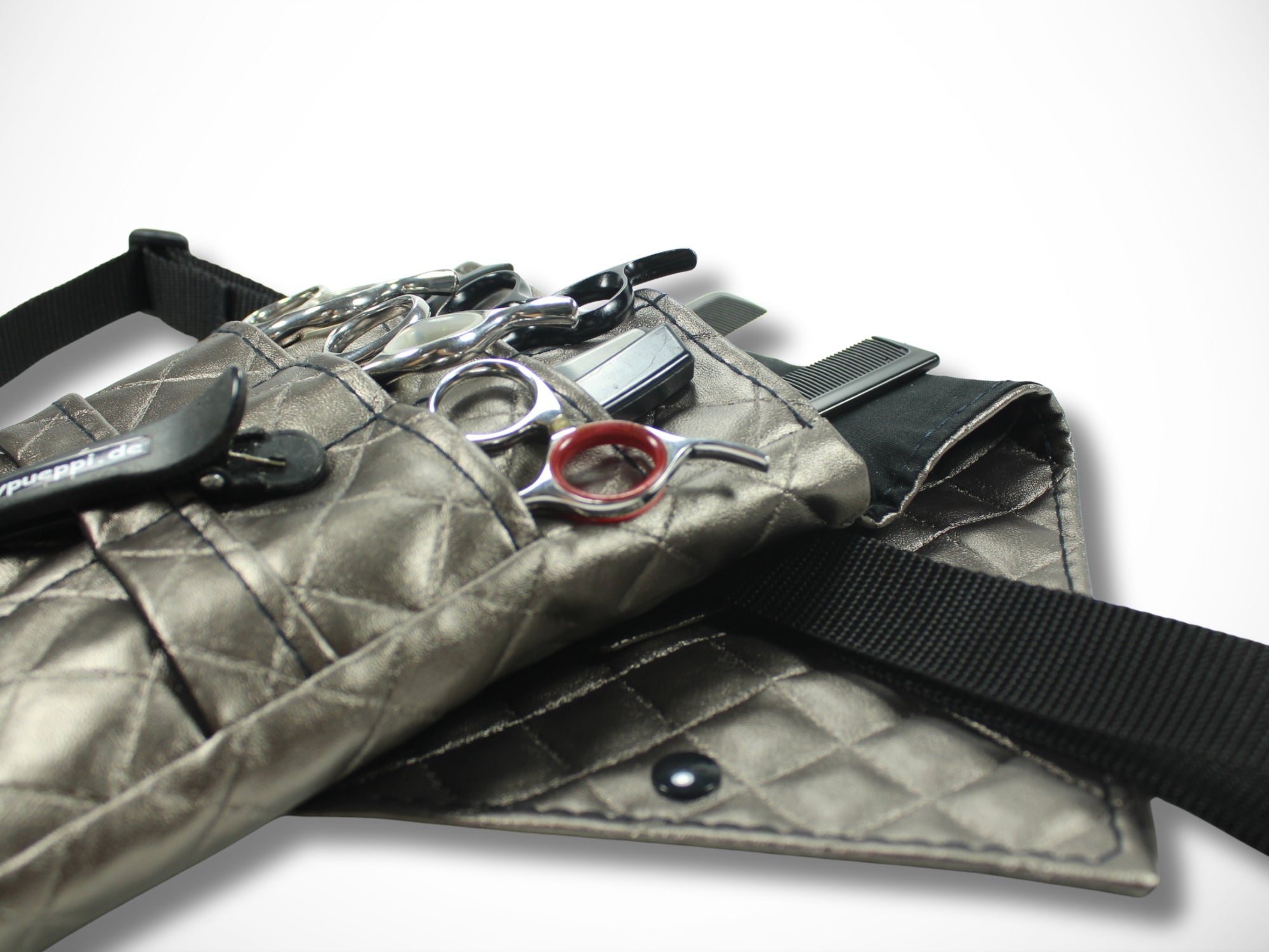 It is worn as a belt bag around the hips and offers plenty of space for your scissors, knives and combs.