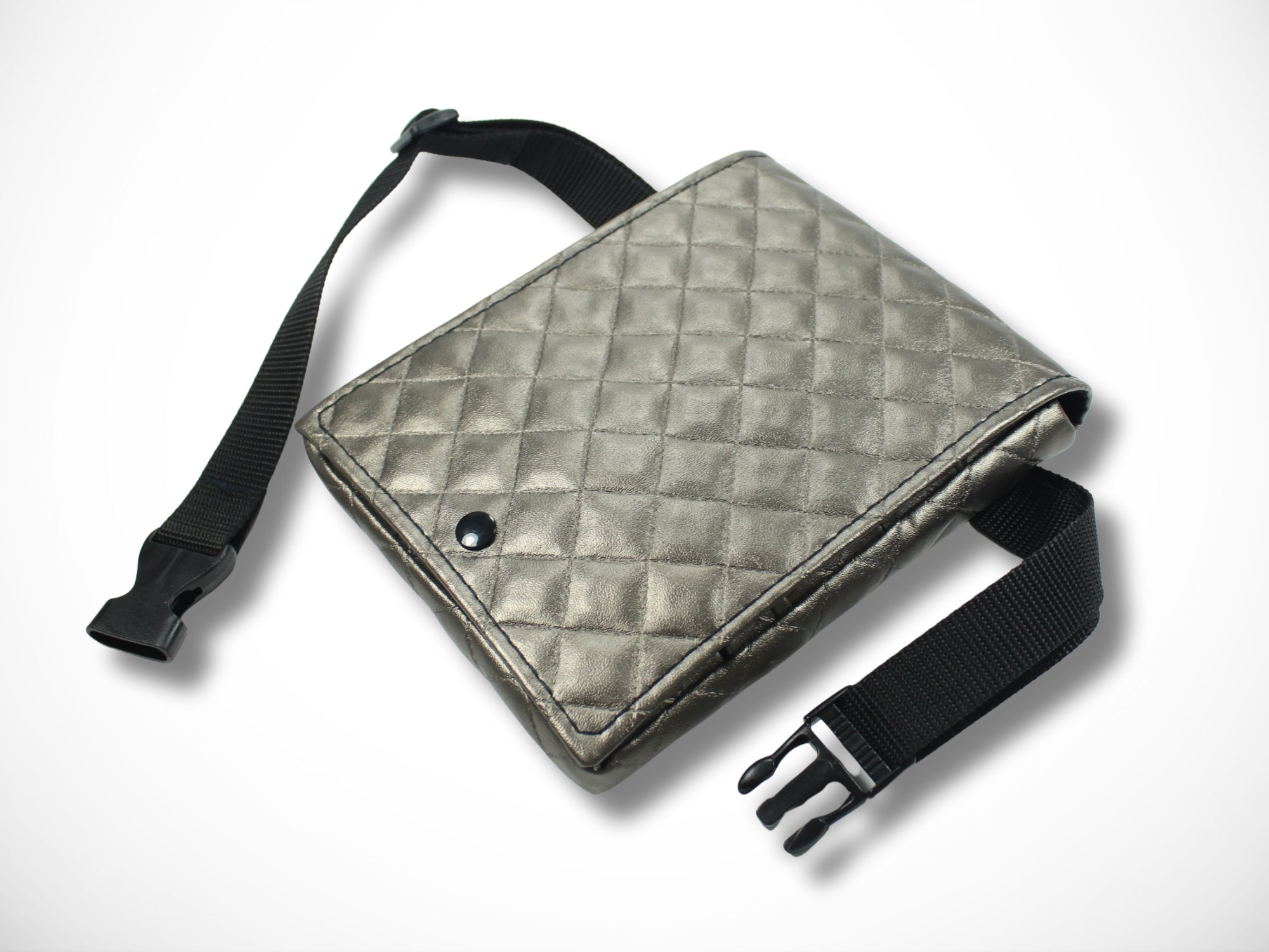 The bag is made of elegant, shimmering black synthetic leather in a quilted design.
