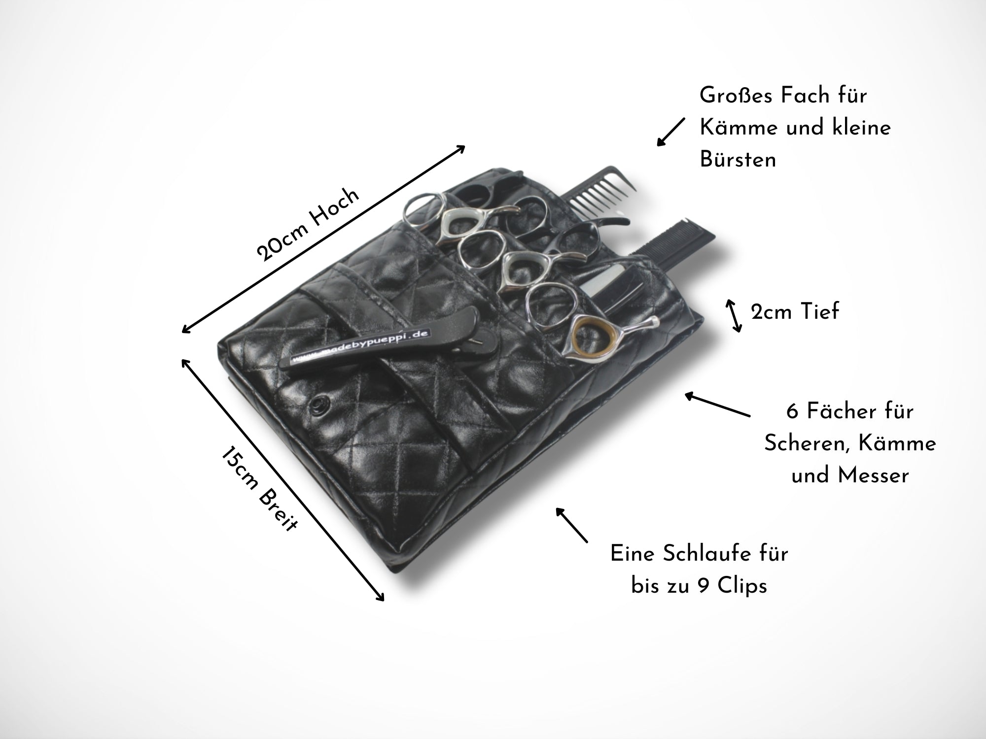 It is worn as a belt bag around the hips and offers plenty of space for your scissors, knives and combs.